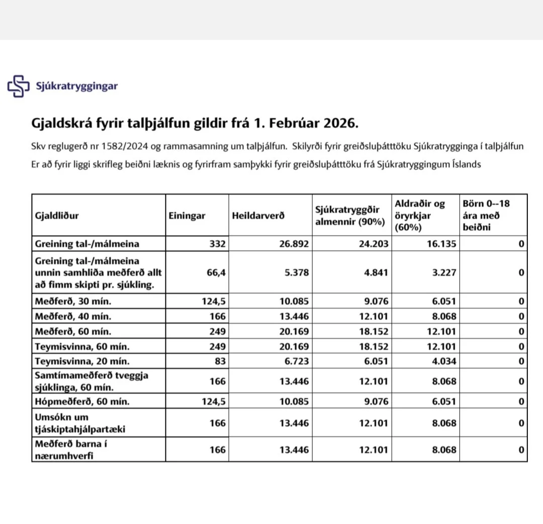 Ekkert gjald er fyrir börn undir 18 ára í talþjálfun ef þau koma með “Beiðni um talþjálfun” frá lækni/hjúkrunarfræðingi og fyrir liggur samþykki um greiðsluþátttöku frá Sjúkratryggingum Íslands.
